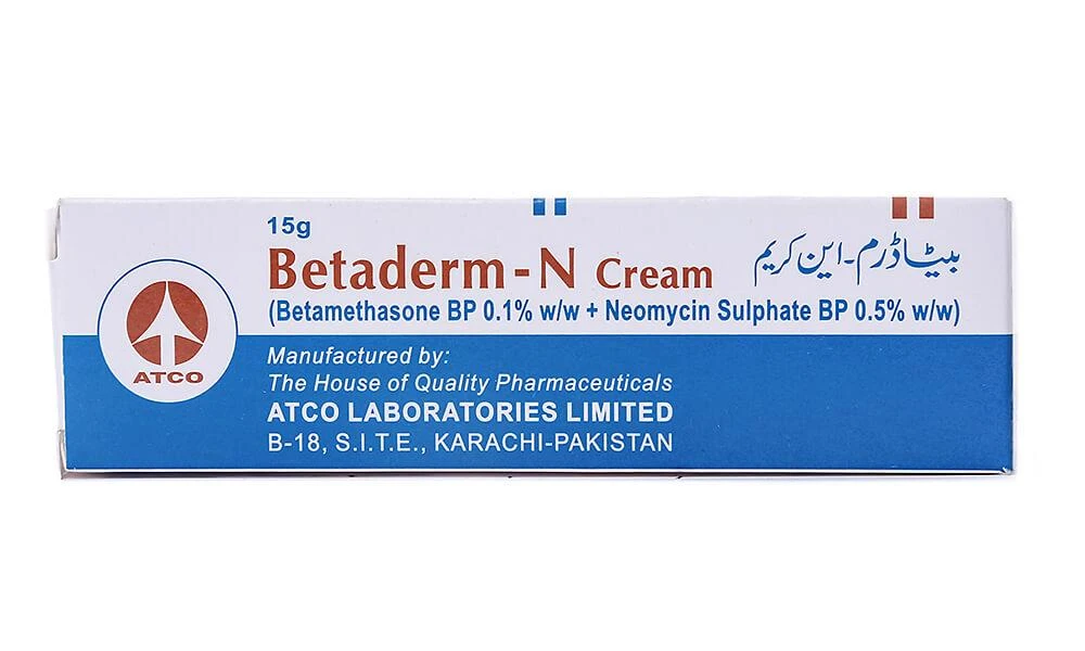 Betaderm-N Cream is a potent topical formulation that combines a corticosteroid with an antibiotic to treat various skin disorders. Manufactured by ATCO Laboratories, this 15g cream contains Betamethasone to reduce inflammation, redness, and itching, alongside Neomycin Sulphate to address or prevent secondary bacterial infections. It is designed for targeted application to affected skin areas as directed by a healthcare professional.