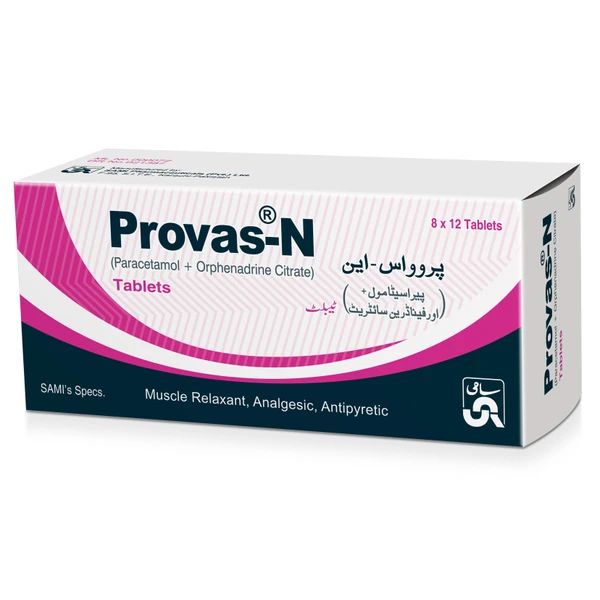 Provas-N is a combination tablet containing Paracetamol and Orphenadrine Citrate, manufactured by SAMI Pharmaceuticals (Pvt.) Ltd. It works as a muscle relaxant, analgesic and antipyretic, providing effective relief from muscle pain, body aches, stiffness and fever.